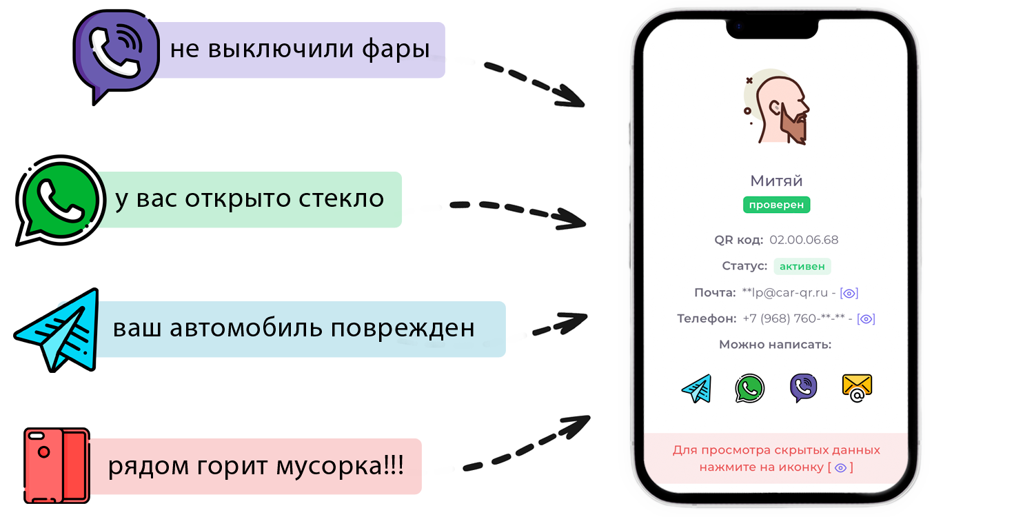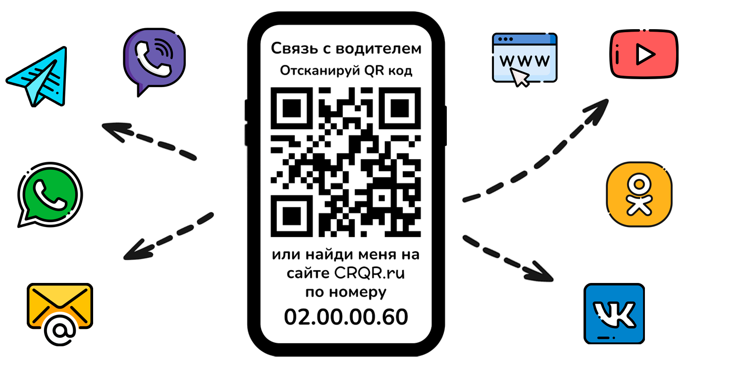 Благодаря автовизитке CarQR любой пешеход или водитель может связаться с вами и сообщить о событии или проблеме с вашим автомобилем тем способом, который вы сами выберете – звонок по телефону, сообщение в Whatsapp, Viber, Telegram или чат в личном кабинете, а также можно подключить опцию подменного номера телефона.